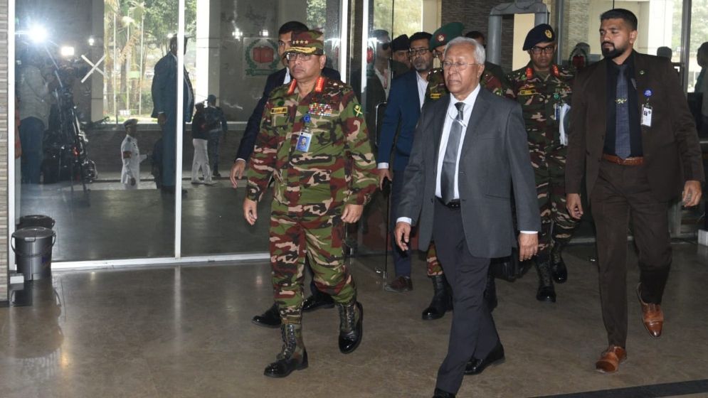 ত্রয়োদশ সংসদ নির্বাচন ও গণভোটকে সামনে রেখে দেশের আইনশৃঙ্খলা পরিস্থিতির সার্বিক অবস্থা পর্যালোচনায় তিন বাহিনীর প্রধানের সঙ্গে বৈঠকে বসেছেনে প্রধান